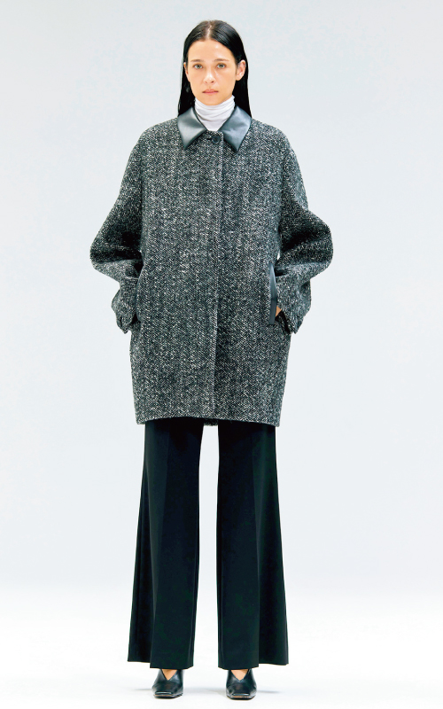 イタリアBALLI(バリー)社のネップツイード素材を使用。上質なツイードに、襟とポケットのフェイクレザーが際立つ、異素材ミックスのデザインです。カジュアルになりすぎない洗練されたデザインで、幅広くアレンジできるおすすめのコートです。