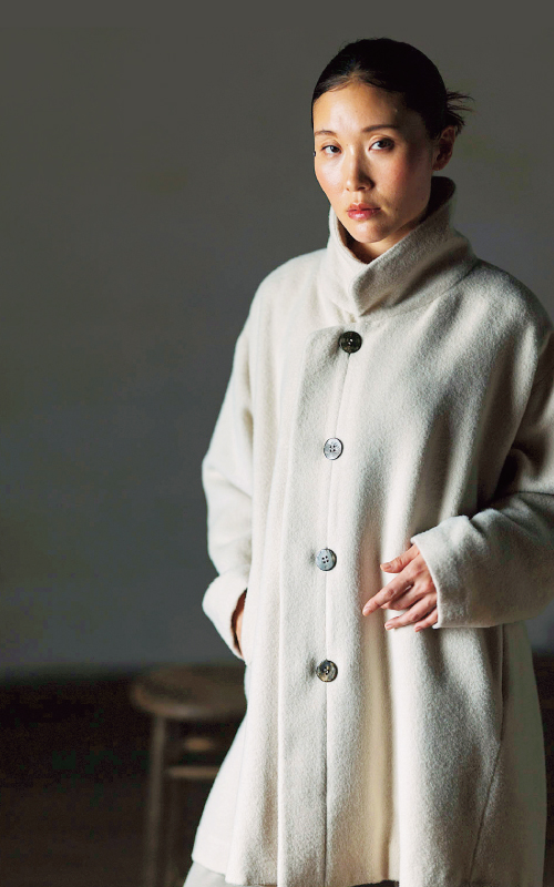 起毛加工を施したコート。ウールとアルパカを使用した軽さと暖かさ、ドレープ性のよさが魅力です。