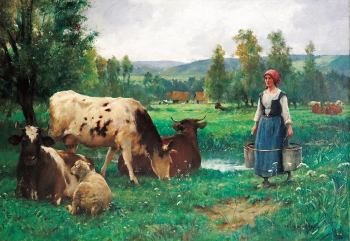 「乳牛と乳搾り」キャンバスに油彩、25M号