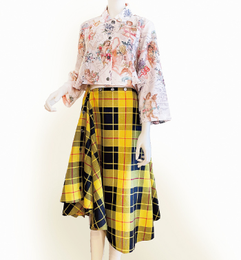 天使と星座の柄が春らしいショート丈のブラウス。英国製タータンをぜいたくに使用したスカートはボタンの開閉でウエスト位置を決めるのでサイズはフリーで、自由度が高く人気です。