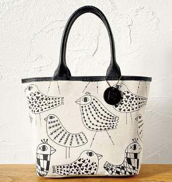 厚手でしっかりとした8号帆布にHappy birdのプリントを施したトートバッグ。イタリア製のシュリンクレザーを使用している持ち手は柔らかく、しっとりと手になじみます。内装はあおり式を採用し、使い勝手がよく日常使いにおすすめのバッグです。