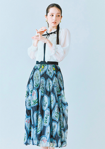 クラシカルなエッセンスをまといながら、モダンに昇華されたフリルブラウスに、カラフルでジューシーさあふれるフルーツのスカートを組み合わせました。