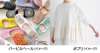 スパンコールやビーズを施した鮮やかな色合いの本革ルームシューズなどモロッコ雑貨の【バービルヘール】、心地よいシルエットを楽しむリネンを中心とした天然素材の日常着【ポプリ】がそろいます。
