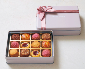 フランボワーズの酸味がふわっと広がる花型のローズベリークッキーとバターの香り豊かなガレットナンテなどを詰め合わせた華やかなクッキー缶です。