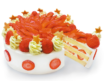 香りが良く甘酸っぱいいちごを、優しい甘さの生クリーム、ふわふわのスポンジと合わせて飾り付けました。ピスタチオクリームのツリーがアクセントになった、ショートケーキです。