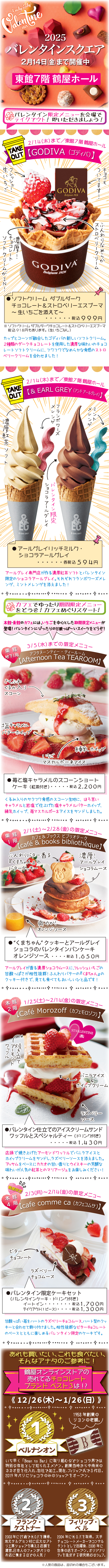 全館でもバレンタインフェアを開催中!バレンタインの期間限定のメニューは、本館・東館のカフェでも楽しめますよ~。どれもいちごを中心とした甘酸っぱ系のスイーツです。(^^)じっくりゆったり楽しみたい方は、期間をご確認いただき、お気に入りのカフェで楽しんでくださいね~。