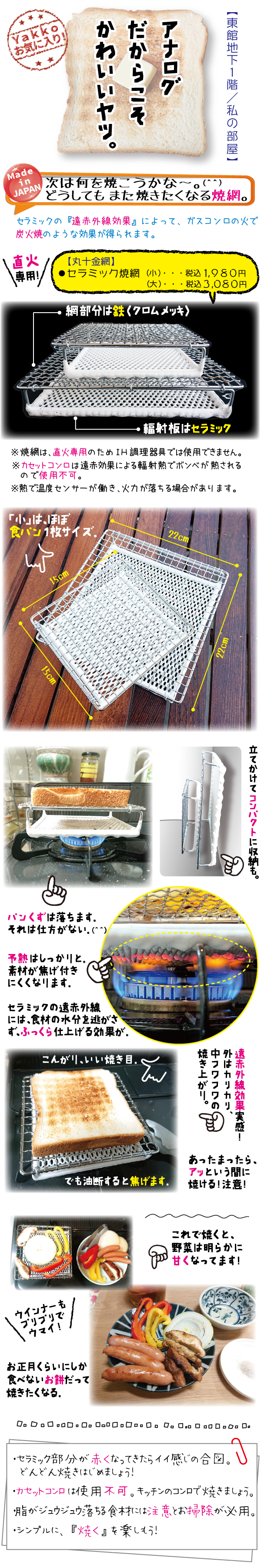 ぽかぽかと暖かくなってまいりました。晴れた日には、お花見やキャンプなどで、外に出ていきたくなりますねぇ。そんな外出の機会を逃してしまった時にYakkoがハマっているのは、《焼網》でパンや野菜を焼く、疑似アウトドアです。つまりインドアなんですけど。(^^)