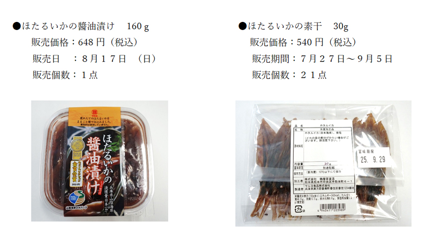 この度、鶴屋本館地下2階「海産物」コーナーにて販売しております「ほたるいかの醤油漬け」および「ほたるいかの素干」商品において、製造販売元であるマルヨ食品株式会社から「食品への使用が認められていない殺菌剤(二酸化塩素)の使用が判明した」旨の連絡がございました。