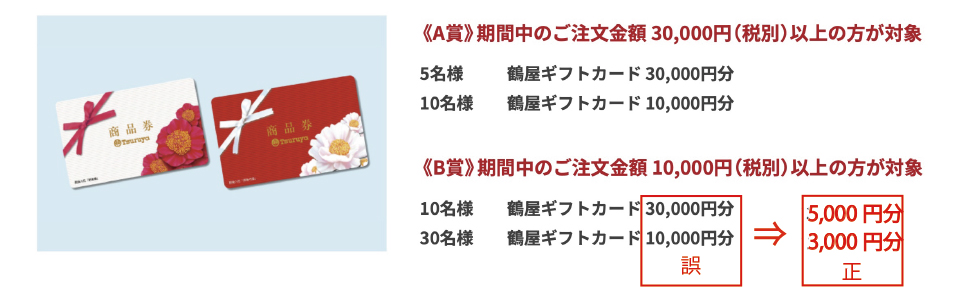 平素は鶴屋オンラインストアをご愛顧いただき、誠にありがとうございます。この度、弊社オンラインストア内に掲載しておりました「ネットで贈る冬ギフトキャンペーン」の内容において、一部表記に誤りがあることが判明いたしました。お客様には多大なるご迷惑をおかけしましたことを、深くお詫び申し上げます。つきましては、下記の通り訂正させていただきます。