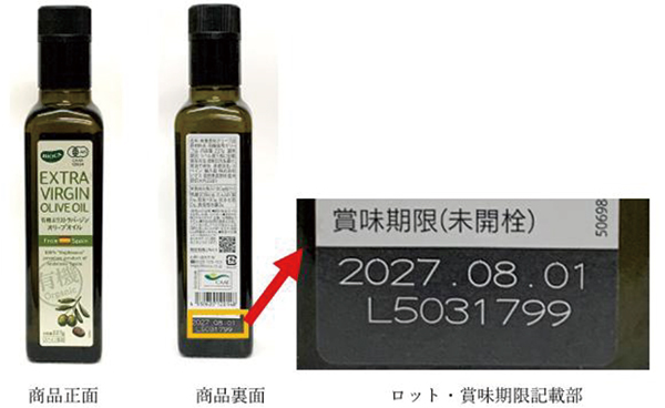 このたび、本館地下2階 グロサリーコーナーにおいて販売いたしました「有機エクストラバージンオリーブオイル 227g」につきまして、販売元より、容器の中栓(ポリスチレン製)が破損し、内容物中に硬質異物が混入する可能性があるとの連絡を受けました。