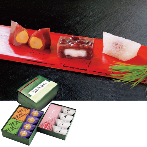 季節限定の「深山守(みやまもり)」や、栗一粒を入れた「栗山家(くりさんが)」が入った詰め合わせ。重箱形式の箱に入った姿はまさに菓子の玉手箱のようです。