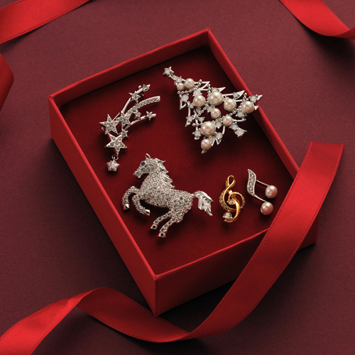 ハッピームード溢れる煌めくブローチコレクション。夢や希望の象徴の流れ星や来年の干支でもある馬を優美にデザイン。