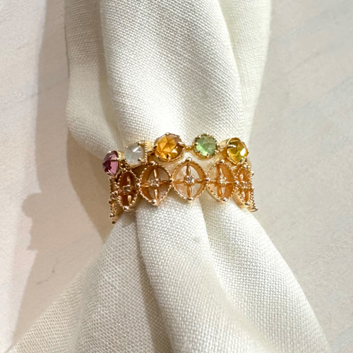 ダイヤモンドをふんだんにセッティングした繊細な透かしのリングに、宝石を閉じ込めたようなマルチカラーのリングのコーディネート。1本でも、重ねても、その日の気分に合わせた自分らしいスタイリングを楽しんで。