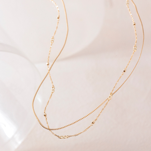光の加減で変化するデザインチェーンとシンプルだけど存在感のあるフラットチェーン。どんなスタイルにも合わせやすく、重ねづけにもぴったりなネックレス。