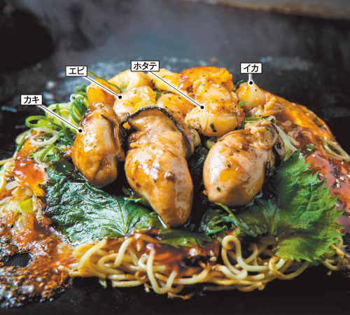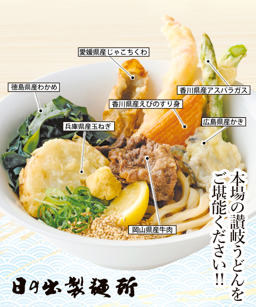 香川県産アスパラガス・えびのすり身、岡山県産牛肉、広島県産かき、愛媛県産じゃこちくわ、徳島県産わかめ、兵庫県産玉ねぎをトッピングした一杯で瀬戸内素材を満喫できる物産展限定メニューです。
