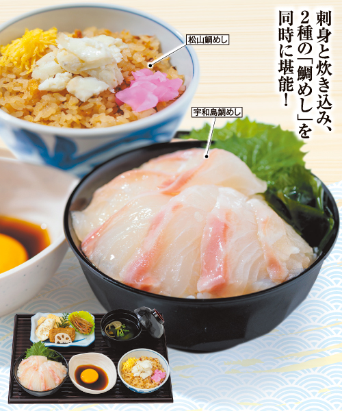 プリっとした歯応えの新鮮な鯛の刺身をしょうゆだしと生卵でいただく「宇和島鯛めし」と鯛と昆布だしで炊き上げたうまみたっぷりの「松山鯛めし」を同時に楽しめます。