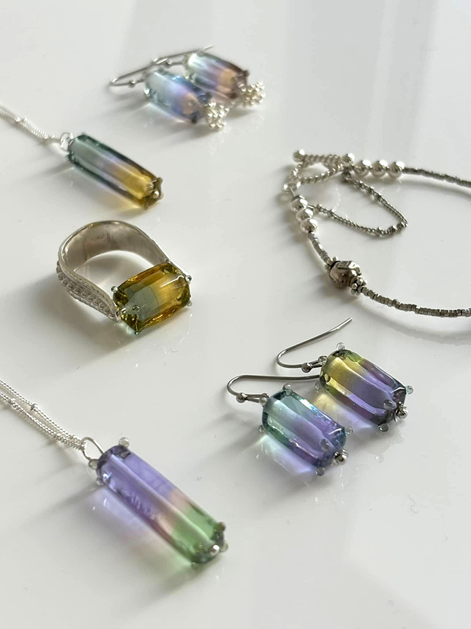 ステンドグラス、キルンワーク、ランプワークなど複数のガラス技法を組み合わせ、 “飾れるオブジェ”としても日常に寄り添う佇まいとなるよう心掛けています。