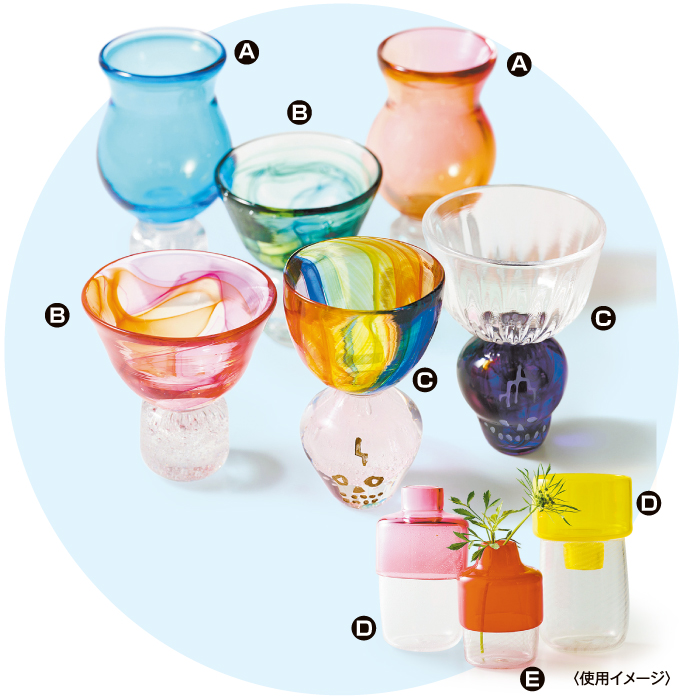 ガラスの塊を高台にした、カラフルでポップなグラス。日本酒用としてもショットグラスとしても。