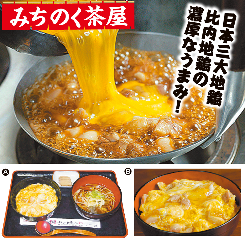秋田県大館市比内町産の150~170日間飼育した雌鶏のみを使用。炭火で皮目を香ばしく焼き、卵を3個使い、半熟でとろりとした親子丼に仕上げます。米は秋田県産あきたこまちを100%使用しています。