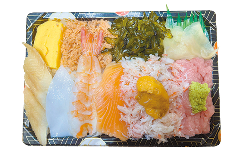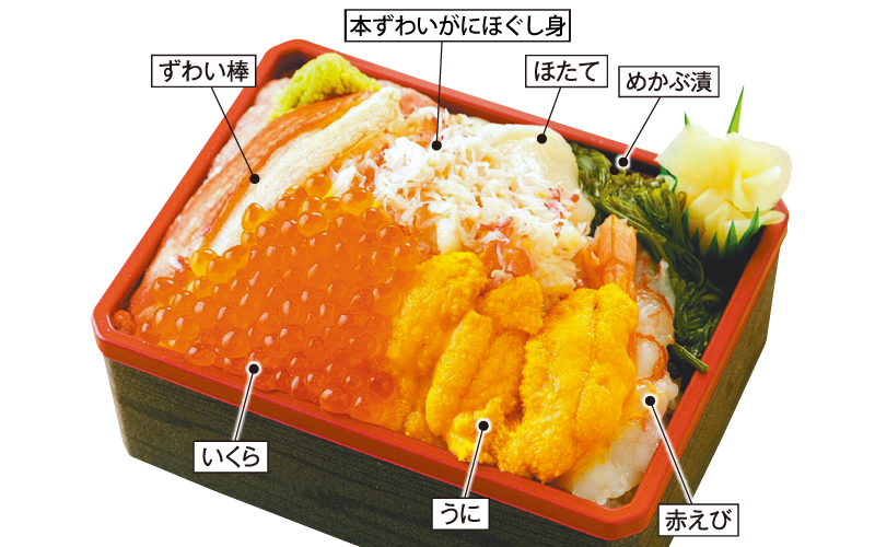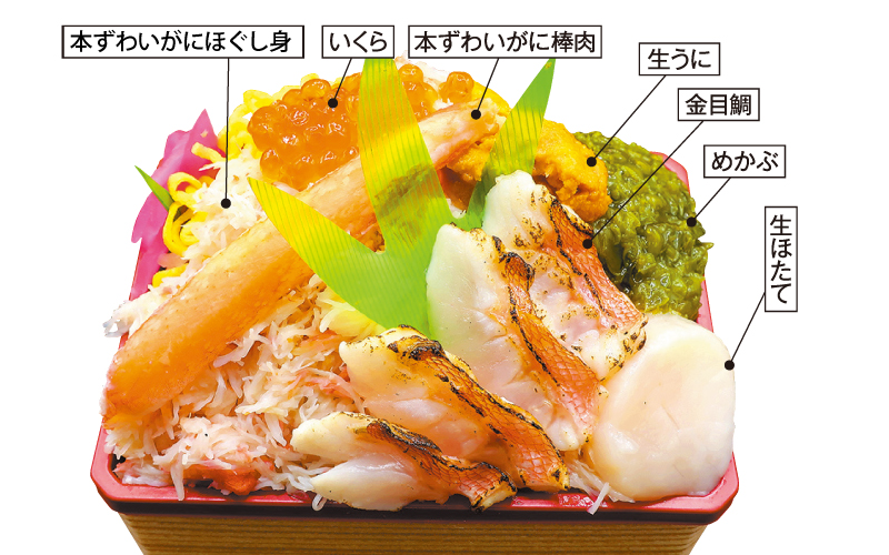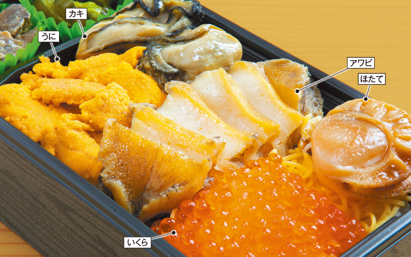 うにと一緒に炊きこんだ酢飯に、やわらかいアワビなどをはじめ5点の海鮮をぜいたくにのせたお弁当です。