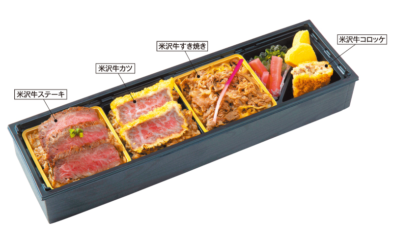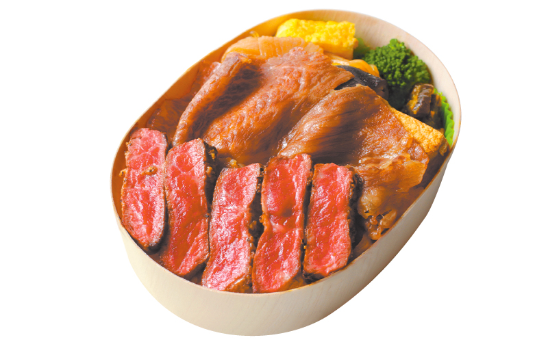 米沢牛のステーキや、牛カツ、すき焼きをのせた、ぜいたくなお弁当です。