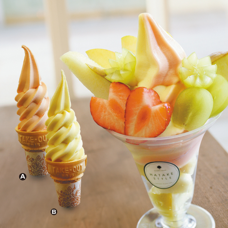 ラフランスとさくらんぼのミックスソフトクリームに、イチゴやシャインマスカットなど山形産のフルーツをぜいたくに盛り付けました。