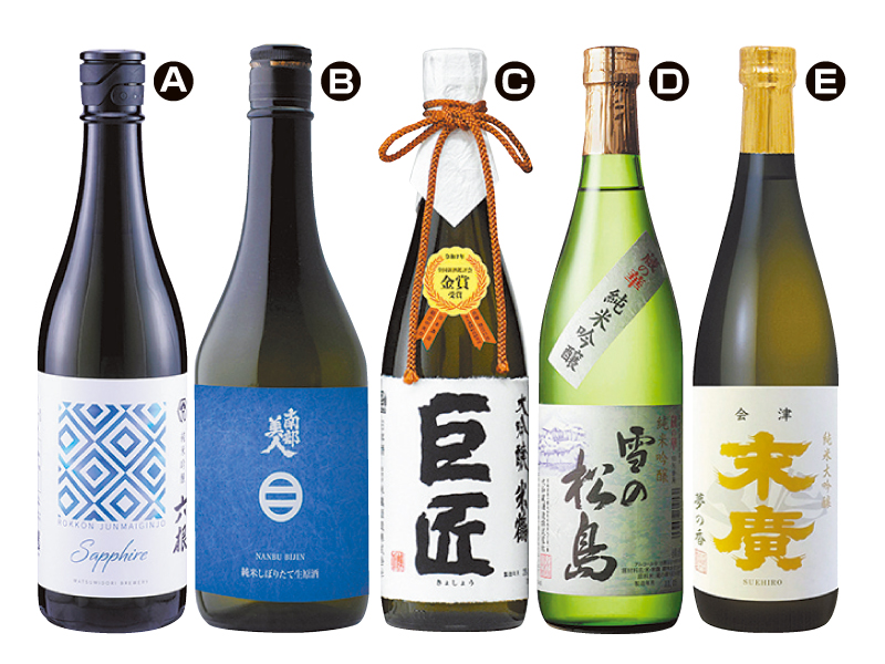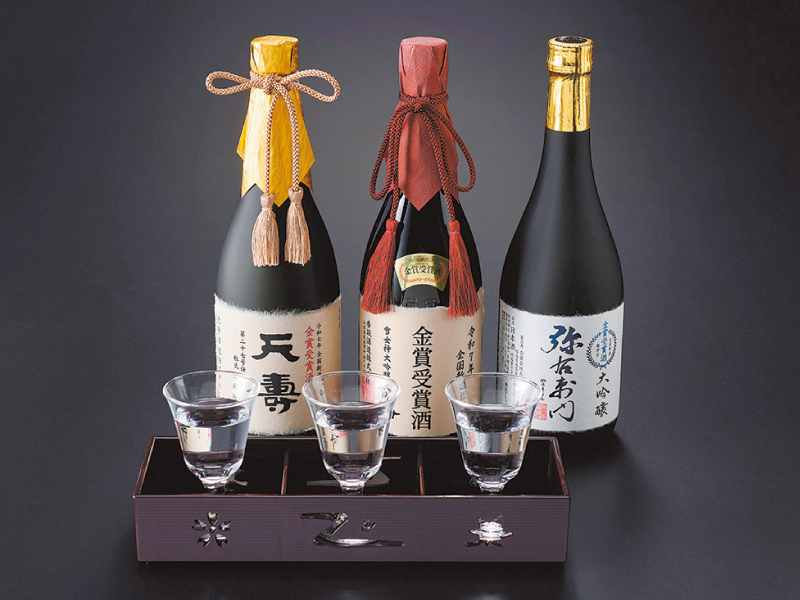 秋田【天寿酒造】天寿(45ml)、山形【香坂酒造】雪女神 大吟醸 香梅(45ml)、福島【大和川酒造】大吟醸 弥右衛門(45ml)