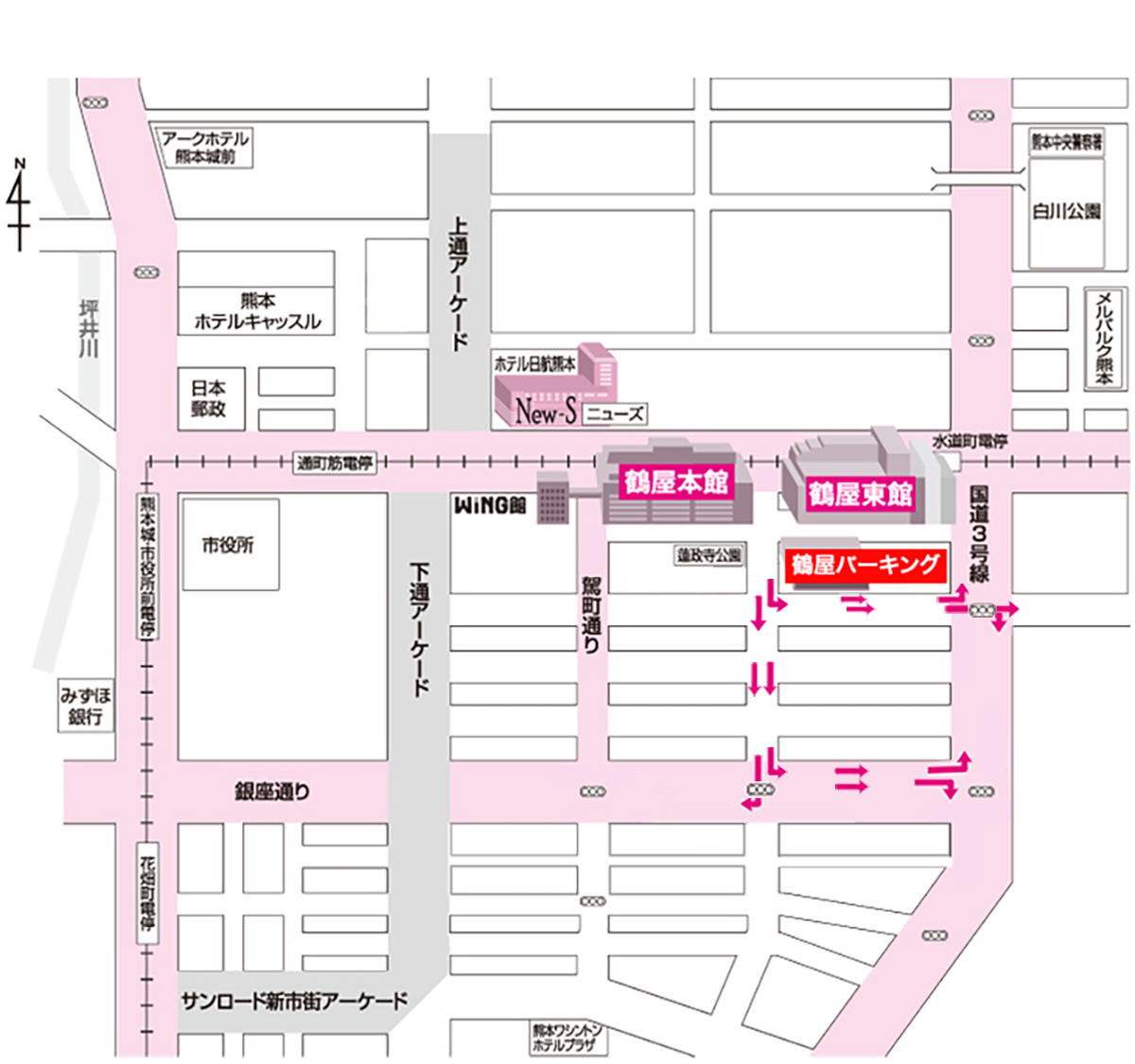 鶴屋パーキングの入庫ルートや駐車料金・ご利用方法や提携駐車場、駐輪場のご案内をしております。