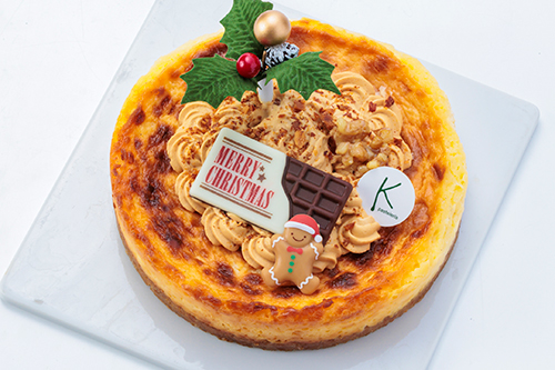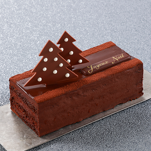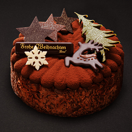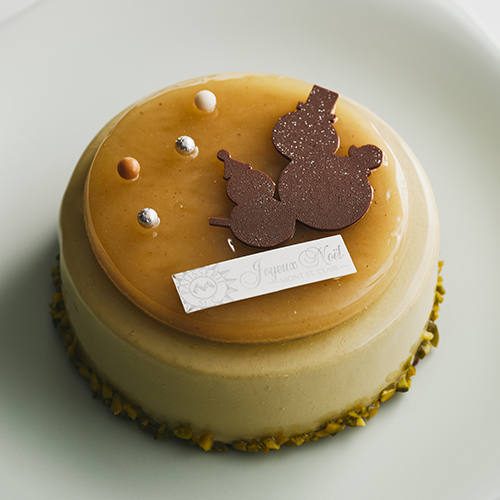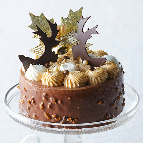 なめらかなチョコレートムースの中に、キャラメルブリュレとチョコレートスポンジ、塩バターキャラメル生地などをしのばせて。チョコレートとキャラメルの優しい甘さのコンビネーションを楽しめる贅沢なケーキで、クリスマスの楽しい雰囲気を演出。お好きな位置にトナカイのチョコレートプレートを飾ってお楽しみください。