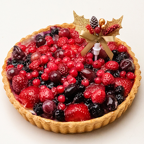イチゴをはじめ数種のベリーやぶどうなど、甘酸っぱいフルーツをたっぷりと飾った華やかなタルトです。 爽やかな酸味とまろやかなコクのサワークリームをたっぷりと使用し、仕上げにシナモンを振った風味豊かなタルトと組み合わせました。