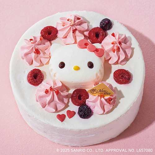 洋梨と黄桃を生地でサンドしクリームでデコレーション。ハローキティをかたどった練乳ムースやフランボワーズをかわいくトッピングしました。