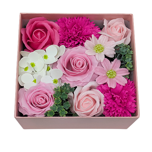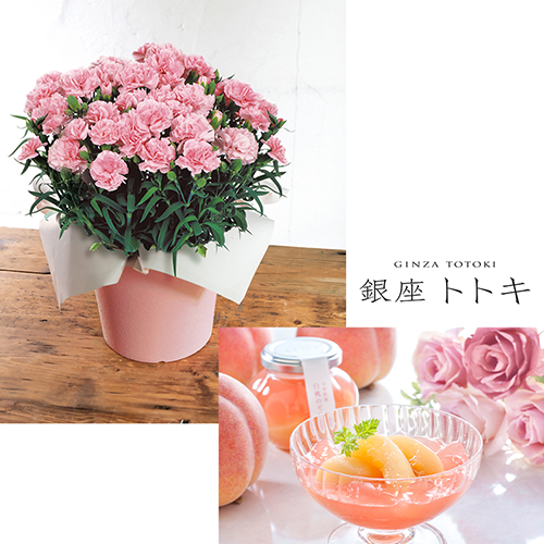 カーネーション感謝の気持ち(ピンク)と銀座フレンチ名店監修の芳醇な香りが口の中いっぱいに広がる山形県産白桃のゼリーのセット