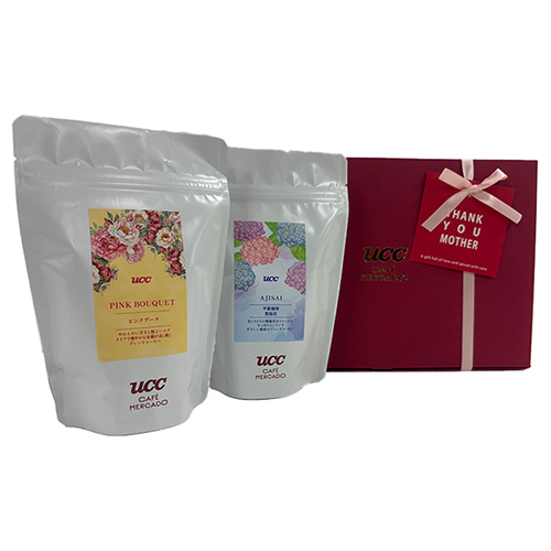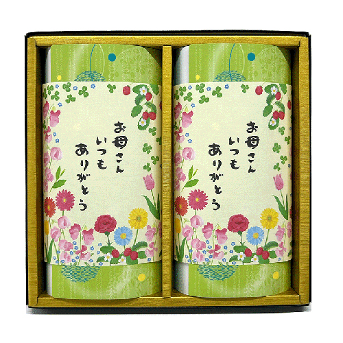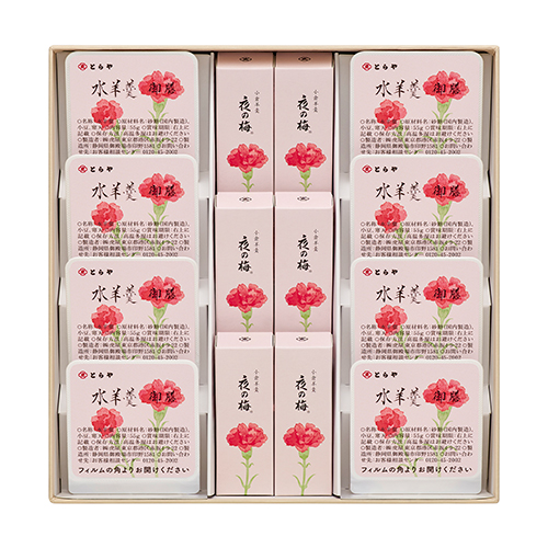 ピンク色の背景にカーネーションのイラストが印象的にあしらわれた華やかなデザインです。とらやを代表する小倉羊羹と、しっかりとした食感とコクのある味わいの水羊羹を詰め合わせました。