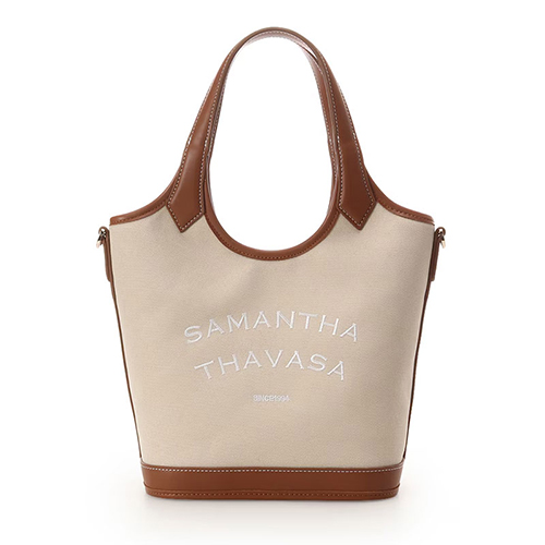 ステッチをきかせたキャメルカラーの合皮とキャンバスを組み合わせた凛とした佇まいのハンドバッグ。ロゴ刺繍をあしらい、大人なカジュアルシーンにぴったりなデザイン。