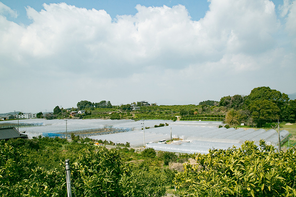 二代目の清田啓治さん、長男で三代目の崇嗣さんを中心に、家族4人と2人のスタッフで圃場を管理。1町5反のビニールハウスでスイカを、3町5反の段々畑で温州ミカンを栽培しています。スイカのハウスは複数の場所にあり、それぞれの土地の特性に合わせて栽培方法を微妙に変えています。また、来年度のスイカ栽培に向けて、きのこ類を育てた菌床に牛糞やもみがらを混ぜて作った堆肥を作るなど、絶えず工夫を重ねています。