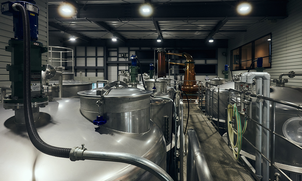 さらに見学用通路を進むと、眼下に現れたのは銅製蒸留器。胴体とネックの間に膨らみがある特注のバルジ型は、地元の伝統工芸「山鹿灯籠」をイメージさせ、冷却器に接続する渡りを上向きにすることで、軽やかながらも華やかな酒質の原酒に仕上げています。蒸留器に設置された覗き窓に目をこらすと、加熱によって醪(もろみ)がボコボコと泡立ち、元気に呼吸をしているようでした。