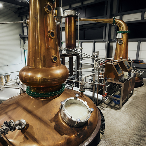 さっそく敷地の中を案内してもらいました。蒸溜所にはビジターセンターが併設され、見学コースからは製造の様子を見ることができます。まず目にとまったのは、ステンレス製の発酵槽。こちらの蒸溜所では一般的なディスティラリー酵母に加えて、味・香りが華やかなエール酵母を採用。これらを麦汁に加えることで、蒸溜後に華やかで複雑な香味を与えてくれるといいます。