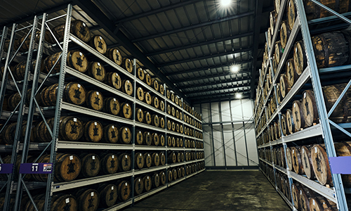続いて案内されたのは、蒸溜所の奥に広がる貯蔵庫。一歩足を踏み入れると、レーズンを思わせる芳醇な香りに包まれました。バーボン、シェリー、ワインなどの熟成に用いられた約2,500もの樽が天井まで並ぶ光景は壮観です。現場を案内してくださった方によると「樽の種類やサイズ、さらには配置による湿度や温度のちょっとした変化が、ウイスキーの表情に違いをもたらします」とのこと。