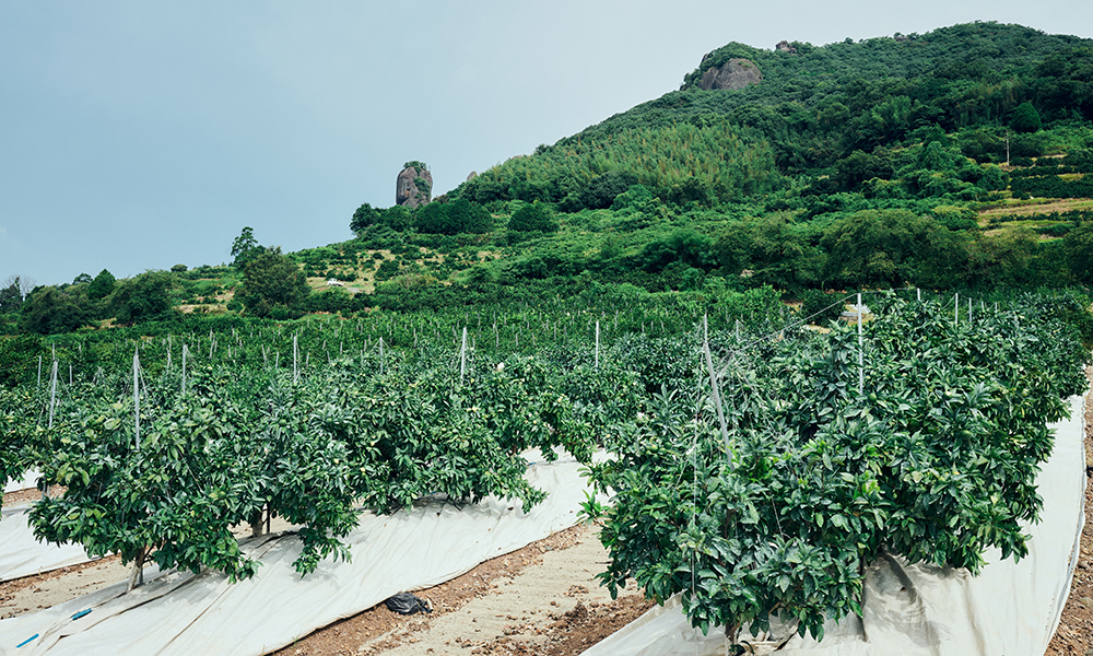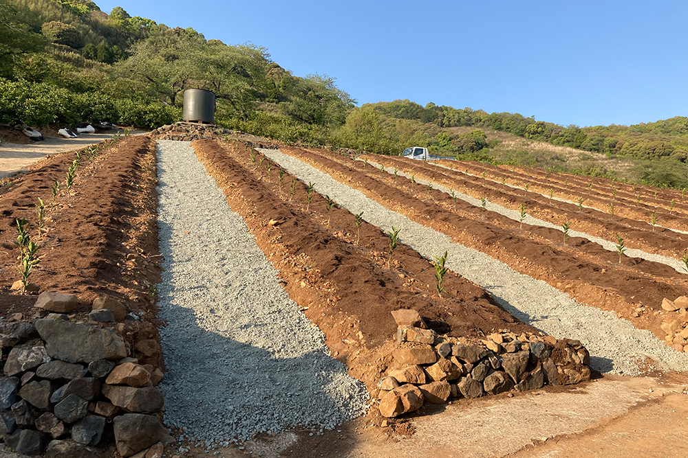 完成まで2年もの期間や相当の費用を費やしたものの、縦列栽培にしたおかげで通路に重機が通れるようになり、また栽培管理や収穫作業も負担が減って省力化。日当たりや風通りも良くなり、雨が降れば水が緩やかに斜面を伝って均等に根を潤すため、水はけと糖度のバランスも最適化されます。さらに、樹姿を人の背丈以下に抑える独自管理、魚粉や堆肥を用いた有機的な土づくりにより、唯一無二の甘みを実現させました。