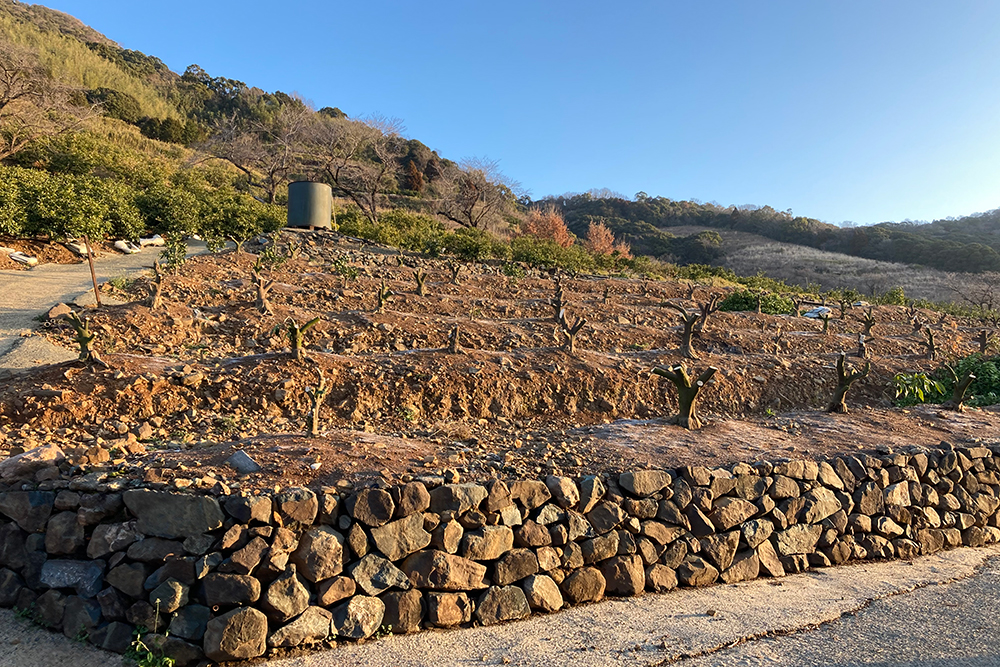 そんなおふたりに案内してもらったミカン畑は1町5反、東京ドーム1.5個分ほどの広さ。そこには横列の果樹畑がある一方で、全く異なる区画がありました。山の傾斜に沿って縦列に植えられた果樹と、列の間にはコンクリートの通路が設けられており、一般的なみかん畑とは明らかに異なる景色が広がっていました。