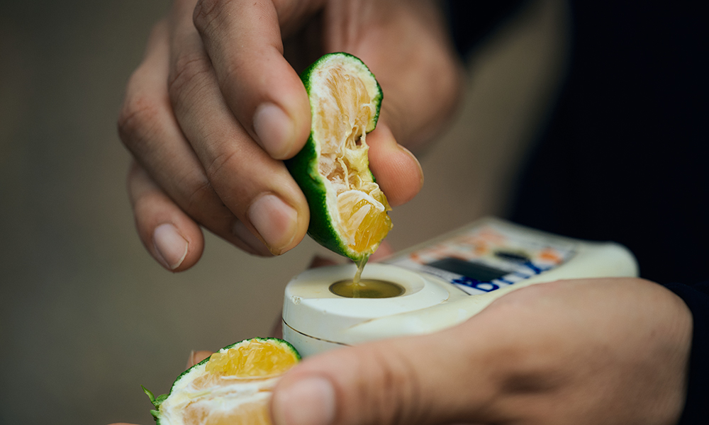 松本さんは安定して高糖度のミカンを出荷するため、糖度計で糖度を測定。一般的なミカンの糖度は11度程度ですが、『不動岩果樹園』ではより高い糖度を合格ラインとして、高品質なものだけを厳選しています。