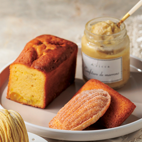 「山鹿栗のパウンドケーキ」は、山鹿産和栗の甘露煮とコンフィチュールを生地に練り込み、しっとりと焼き上げた人気商品。生地から広がるバターの香りとホクホクの栗の甘さ、ほのかに香るブランデーが調和し、紅茶やコーヒーとの相性も抜群です。一切れの中に栗の豊かな表情が詰まっていて、食べ進めるほどに素材の力を感じさせます。
