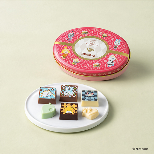 「ゴディバ meets どうぶつの森」が「ティーパーティ」のコンセプトで新登場。人気のしずえをはじめ、フランソワ、ティーナとジャックをデザインしたプリントチョコレートと、作中に登場する葉っぱ、ハートをモチーフにしたチョコレート合計6粒を、チョコレートと共通のキャラクターを描いた、鮮やかなピンクのオーバル形の缶に詰め合わせました。