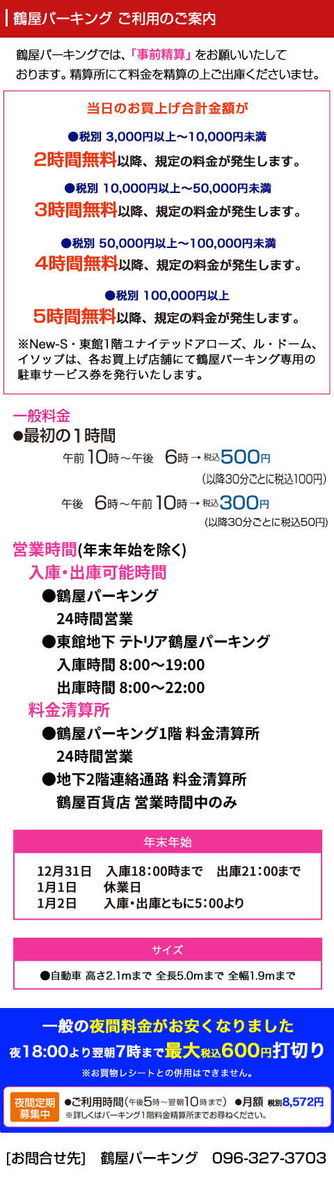 平日にお車でご来店の際は、鶴屋パーキングをご利用ください。
