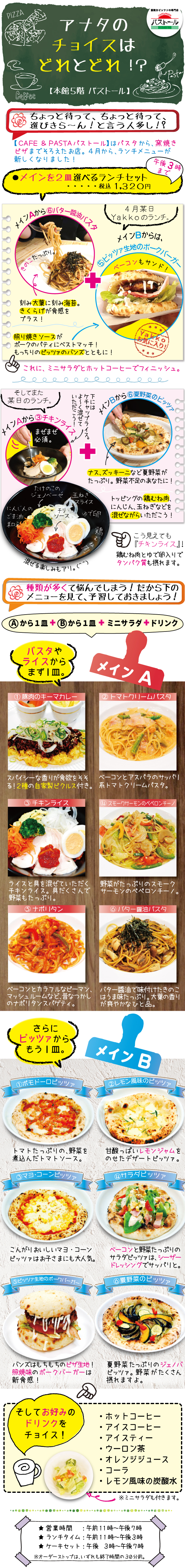 期間限定のパスタもあれば、季節限定の苺メニューも!どれを食べるか、どっちもいただくか、悩んでください!(^^)