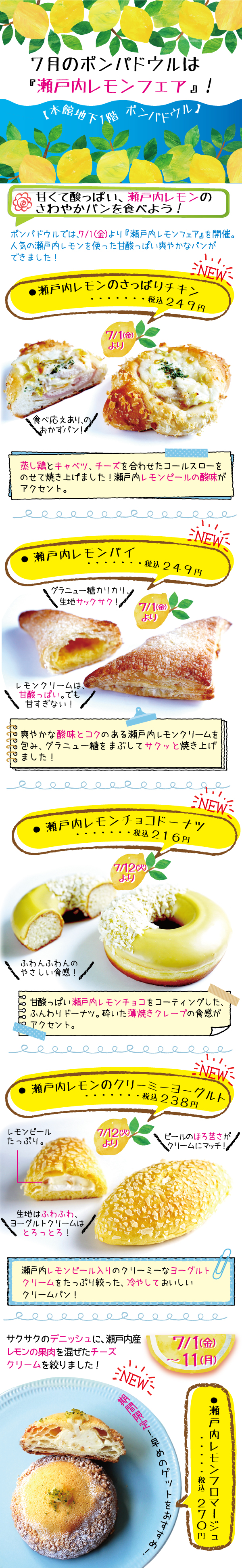 7月12日(火)には、甘酸っぱい瀬戸内レモンチョコでコーティングした『瀬戸内レモンチョコドーナツ』と、クリーミーなヨーグルトクリームにほろ苦レモンピールがベストマッチの冷やしておいしい『瀬戸内レモンのクリーミーヨーグルト』も登場します!