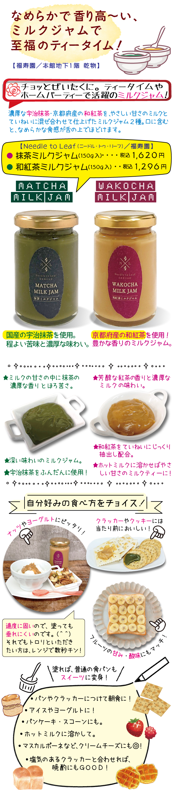 本館地下2階のグロサリー売場の、SNSなどで話題の【ラクシュミー】の『極上はちみつ紅茶』がオススメ。箱を開けた途端にはちみつがフワ~っと香ります!神戸発の紅茶専門店【ラクシュミー】のオリジナルのこの紅茶、スペイン産の《百花蜜》をたっぷり使用。はちみつパウダーに加工してティーバッグに入っています。ちょっと甘すぎるかな~、と思ったら、ミルクや豆乳で割るのも◎。レモンやオレンジスライスをいれれば、爽やかさが増します。寒い日は生姜を刻んで淹れると温まりますよ。(^^)『極上はちみつ』シリーズには、他にも『極上はちみつ ミントティー』もあります。爽やかな香りのミントティーはノンカフェイン。はちみつとミントは相性バッチリ。気分をスッキリさせたい時にどうぞ。どの紅茶もその香りと甘さで癒されます!