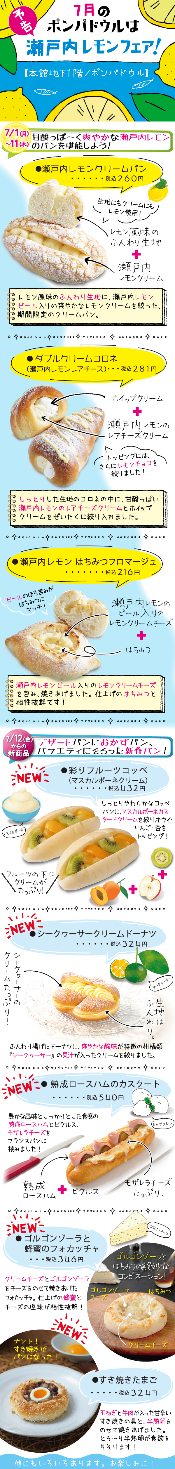 7月1日(金)~11日(月)販売の、『瀬戸内レモンフロマージュ』は、レモンの果肉入りのチーズクリームが歯ごたえサクサクのデニッシュ生地にインの、爽やかなベイクドチーズのデザート。ティータイムにもピッタリ。