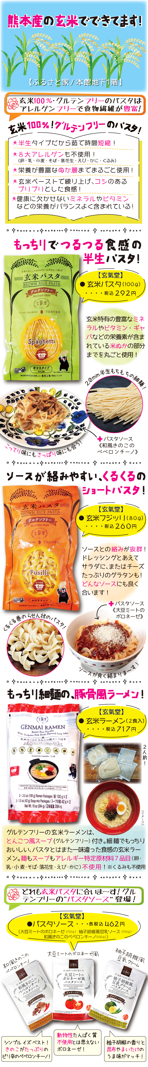 先日、イタリア展を満喫したばかりのYakkoですが、もうパスタが食べたい!(^^)実はしばらく前から気になっていたパスタがあったのでした。それは、本館地下1階のふるさと家にある、【玄氣堂】の『玄米パスタ』。熊本県産の玄米100%使用のパスタです!