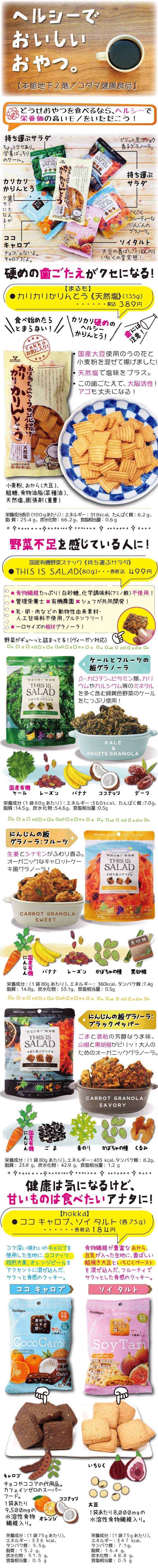 “持ち運ぶサラダ”『THIS IS SALAD』は、有機野菜をメインに使ったグラノーラシリーズの名前。種類は《ケールとフルーツの板グラノーラ》、《にんじんの板グラノーラ:フルーツ》、《にんじんの板グラノーラ:ブラックペッパー》などがあり、どれも栄養豊富な有機野菜をおいしく手軽に摂取できます。このグラノーラ、板状にギュ~っと固めてあるので、指で気軽につまんでいただけます。(^^)もちろん牛乳やヨーグルトをかけて食べていただいてもOK。白砂糖、調味料(アミノ酸)、人工甘味料不使用で、原料は主に野菜や果物、ナッツ。乳・卵・肉などの動物性由来の素材は不使用でグルテンもフリー!1袋で1日分の食物繊維が約1/3摂れます。品名通り、“持ち運ぶサラダ”です。(^^)野菜不足を手軽に補いたい方、健康にお菓子を食べたい方にオススメです!
